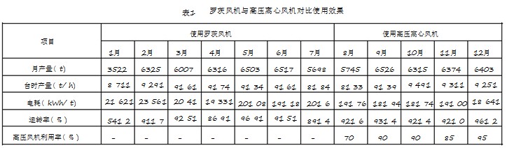 1.11 羅茨風機與高壓離心風機對比使用情況以 1995 年為例, 羅茨風機與高壓離心風機對比使用效果見表 1。