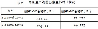 入窯生料的均勻程度是保證立窯煅燒的基礎(chǔ)上,生料成分愈趨于穩(wěn)定, 立窯煅燒愈穩(wěn)定, 窯內(nèi)通風(fēng)阻力越均勻。如果入窯生料成分頻繁發(fā)生波動, 立窯就不能處在一個穩(wěn)定的狀態(tài), 熱工制度會經(jīng)常遭到破壞, 窯內(nèi)的通風(fēng)阻力也會時大時小, 造成高壓離心風(fēng)機很難適應(yīng)。從我廠 兩條機 立窯的 生產(chǎn) 實際 情況分 析,5 310m @ 10m 生產(chǎn)線的原料系統(tǒng)有 2 個石灰石倉, 配料過程可搭配使用, 且配料采用計量較精確的失重秤, 因此出磨生料碳酸鈣合格率、三氧化二鐵合格率均高于 5 215m @ 10m 機立窯線 10% 左右, 入窯生料的均 勻性較好 , 所以高 壓高心 風(fēng)機應(yīng) 用的效 果好于5 215m @ 10m 的機立窯。兩條生產(chǎn)線出磨生料合格率對比情況見表 2。 .jpg)