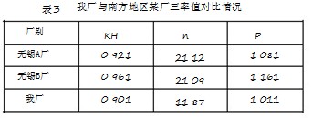 我廠原料特性較差, 為保證生料的易燒性, 不得不在配料時選擇較低的 n 值( 一般低于 119) 。由于液相量偏高, 易結(jié)大塊, 因此高溫帶阻力較大, 在操作中一旦掌握不好, 易產(chǎn)生粘邊、抽心、還原等不正常窯情, 因此增加了離心風(fēng)機使用的難度。而南方一些地區(qū)由于其原料特性較好, 生料易燒, 一般其配料的 n值選擇較高 ( 一般在 212 左右) , 底火阻力小, 通風(fēng)狀況好, 為高壓離心風(fēng)機的應(yīng)用提供了良好的條件。我廠與南方地區(qū)某廠三率值對比情況見表 3。