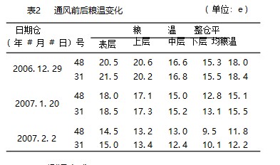 ~ 8: 00 進(jìn)行通風(fēng), 將平均糧溫降到 15 e ; 在*冷時(shí)段( 外溫 7 e ) 采用 24h 連續(xù)通風(fēng)。通風(fēng)后, 31 倉(cāng)平均糧溫降至 12. 2 e , 累計(jì)通風(fēng) 51 h, 48 倉(cāng)平均糧溫降至 11. 8 e , 累計(jì)通風(fēng) 41 h。糧溫變化情況見(jiàn)表 2。