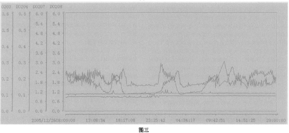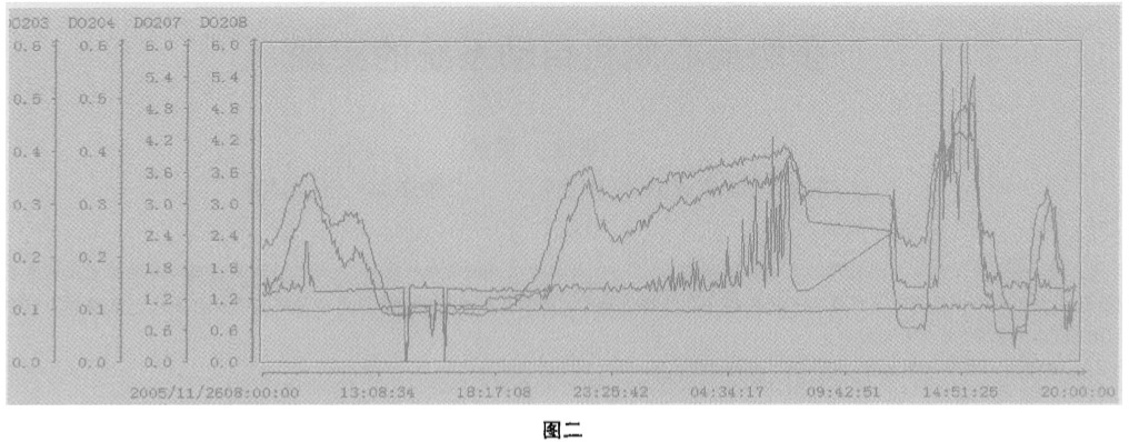 4 運行效果 圖二 是2 00 5 年 n 月 26 日 8 時 至 28 日 20 時系統(tǒng)建立 前 的 D O 曲線。 從 圖中的 D O 曲線可 以看出 , 在 自控 系統(tǒng)建 立 前 , 由 于 風(fēng) 機 轉(zhuǎn) 速 采 用 人 工 控 制 , D O 值 (D 0 20 7 、 D O20 8) 波動較 大 , 在 0. 6 一4. 8 之 間反復(fù)無 常地 變化 , 并遠 遠偏離 D O 的工藝要求值在 1 . 5 一2. 5 之間的控制 范圍 。 圖三是 200 5 年 12 月 2 6 日 8 時至 28 日 20 時 系統(tǒng)建 立后 的 DO 曲 線 。 從 圖 中的 D O 曲 線可 以看 出 , 在 自控系 統(tǒng)建 立后 , 由于風(fēng) 機轉(zhuǎn)速采用 自動控制 , DO 曲線 基本上是較為 平穩(wěn) , 僅是在 27 日 0 時左右在停一臺提升泵后 , 因進水量 一 減 少 一 半 , 造 成 D O 值 突 然 升高 , 但 D O 值 (D 0 207 和 D O20 8 的 平 均值 ) 仍在工 藝要求 值 1. 5 一2. 5 之 間 的 控制 范 圍 。 通 過 系統(tǒng)建立 前后一個月 內(nèi)同一時 段的 D O 曲線進行對 比 , 說明了該 自動控制系統(tǒng)完全達到對土藝參數(shù) D O 值的控 制要求 。 由于 該 自動控制系統(tǒng)是在綜 合地考慮風(fēng) 機的機械 運 行特性 、 計算機 通訊 和 變頻器柜 的控制等各方 面因素而 建 立 的 , 系統(tǒng)經(jīng)過半年多 時間 運行 , 一直能對生產(chǎn)過 程的 不藝進行有效穩(wěn)定地控制 。