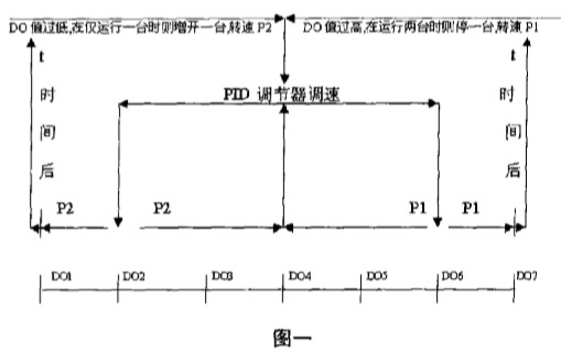 5 .4 D O 值在 D 0 2 與 D 0 6 之間 時 , 保持 現(xiàn) 已.運行 的 風(fēng) 機 (可 能 兩臺 , 也可 能一 臺) , 風(fēng)機轉(zhuǎn) 速用 PID 調(diào)節(jié) 器進行 調(diào)節(jié) 。 如果 D O 值繼續(xù)下降小于 D OZ 時 , 按下第 3. 5. 5 步執(zhí) 行 ; 或者 DO 值繼續(xù)上升 到 D O6 值時 , 則按下面第 3. 5 .6 步 執(zhí)行。 3. 5. 5 D O 值 小于 DOZ 時 , 將 風(fēng)機轉(zhuǎn)速緩慢地調(diào)高至 PZ 穩(wěn)定運行 。 D O 值繼續(xù)下 降小于 D OI 且保持 t 時間 后 , 在只 開 一臺風(fēng)情況下 , 則按下面第 3. 5. 7 步執(zhí)行 。 如果 D O 值小 D 0 1 且 已開 兩臺風(fēng)機時 , 則繼續(xù)保持轉(zhuǎn) 速為 PZ 穩(wěn) 定運行 。 或者 D O 值繼續(xù)上升到 D 0 4 時執(zhí)行第 3 5 . 4 步 。 3. 5. 6 D O 值大于 D O6 時 , 將轉(zhuǎn)速緩慢地調(diào) 低至 Pl 穩(wěn)定 運行 。 當(dāng) D O 值繼續(xù)上升大于 D O7 且保持 t 時 間后 , 在已 開兩 臺風(fēng)機時 , 執(zhí)行第 3 . 5名 步 。 當(dāng) D O 值大于 D o 7 且僅開 一 臺風(fēng) 機時 , 則繼 續(xù)保持轉(zhuǎn)速為 PZ 穩(wěn)定運行 。 或者 DO 值下降到 D O4 時執(zhí)行第 4 步 。 3. 5 7 當(dāng) D O 值降至小 于 D OI 時 , 例如只 開 2# 風(fēng)機 , 則 判斷 3# 風(fēng)機是否 正 常且 已在遠程 自動狀態(tài) , 是則起動 3# 風(fēng) 機 , 否則繼續(xù)判 斷 l# 風(fēng)機 。 將兩 臺風(fēng)機轉(zhuǎn)速緩慢地 調(diào)節(jié) 到 P2 , 然后穩(wěn)定運行 , 當(dāng) D O 值升到 D0 4 時 , 用 PID 調(diào)節(jié)器進行 調(diào) 節(jié) 。 3 . 5 . 8 當(dāng) D o 值升至大 于 D O7 , 停其 中一臺非主風(fēng)機 。 如 果 D O 值繼續(xù)上升 則穩(wěn) 定轉(zhuǎn)速在 Pl 運行 。 或者 D O 值將會緩慢地下降 , 當(dāng) D O 值降到 D O4 時 , 執(zhí)行第 4 步 。 3.5. 9 第 3. 5. 4 一3. 5. 8 步互相配合執(zhí)行 。 3. 5 . 10 控制過程 圖如下圖一所示 :