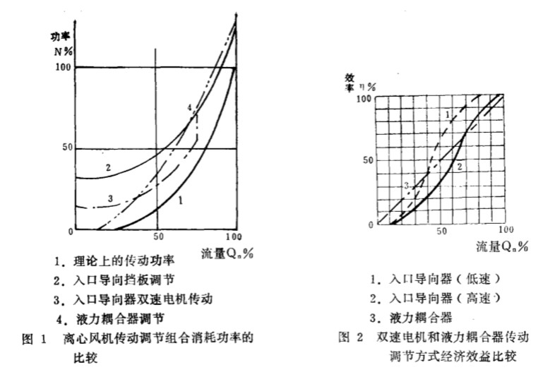 ( l ) PA M 雙 速 電 機(jī)傳動 調(diào) 節(jié) PA M ( Po le 一A m p litu d e 一M o d u la tio n 即 極 幅 調(diào) 制 ) 單繞組雙速 電機(jī)是變極調(diào)速應(yīng)用較為廣泛的一 種形式 , 在電機(jī)轉(zhuǎn)速改變時 , 基本保持額 定滑差 , 無轉(zhuǎn)差功率損耗 , 所以屬 高效調(diào)速 裝置 。 單繞組雙 速 電機(jī) 自 195 7 年問世 以來 , 國 外已廣泛應(yīng) 用 , 近 年來國內(nèi)也正在推廣應(yīng)用。 雙速 電機(jī)傳動實(shí)際上是定級調(diào) 速 , 必須和 風(fēng)機(jī) 入口 導(dǎo)向擋板配 合使用 , 設(shè) 計(jì)時按雙速設(shè) 計(jì) , 可勸兩種極數(shù)作經(jīng)濟(jì)合理選擇。 在規(guī)定的兩檔轉(zhuǎn)速條件‘ 下 , 當(dāng)入 口 導(dǎo) 向擋板全開 時風(fēng)機(jī) 效率最 好; 當(dāng)導(dǎo) 向擋板關(guān)小時 , 仍然 存在著節(jié)流損 失, 風(fēng)機(jī)的 效率 也會 下 降。 但 由于有 兩檔 轉(zhuǎn)速 可調(diào) 節(jié), 風(fēng) 機(jī)在整個負(fù)荷范圍內(nèi)的效率是有所改善 。 用PA M雙速 電機(jī)驅(qū)動風(fēng)機(jī)是一種十分有效的動力裝置 , 可 以獲 得顯著的效益 。 但 對 已 定型的單速 電機(jī)改成雙速 電機(jī) , 要得到理 想的經(jīng)濟(jì)方案就 比 較困難 , 條 件亦較苛刻。 ( 2 )調(diào)速 型 液 力搞 合 器 這是一種 以液體作為介質(zhì)傳遞功 率的新型 傳動裝置 , 在主動 軸轉(zhuǎn)速不變的條件下 , 只 要改變液力 藕合器工作腔 中工作液體 的充滿度 , 就能無級地改 變從 動軸的轉(zhuǎn)速 。 液力禍合器的調(diào)速范圍為 20 一 97 % , 有 速度損失 , 無法達(dá) 到額定速度運(yùn)轉(zhuǎn), 轉(zhuǎn)差功率均 以發(fā)熱形 式損耗掉 。 最大 的功率損失為所傳的額 定功率的 15 % 左右。 所 以 屬 于 低效調(diào) 速裝置。 由于調(diào) 速型液力藕合器 的主從動 l汁輪之 間不 存在任何的機(jī)械聯(lián)系 , 所 以它具 有 如 下 優(yōu) 點(diǎn): 過載保護(hù)簡單 、 節(jié)能、 空載啟動電動機(jī) 、 緩慢加速風(fēng) 機(jī)、 工 作安 全 可 靠 、 使 用 壽 命 長等 。 2 . 雙速電機(jī)和 液力藕合器 調(diào)速 裝邏的輸入功率和效率比較 圖 1 和圖 2 表示 了隨實(shí) 際負(fù)荷變化 , 離心風(fēng) 機(jī)采用 和 效率的曲線 , 并明顯地 電機(jī)傳動調(diào) 節(jié)和采用 液力藕合器變速調(diào) 節(jié)方式組 合所 耗功率 入 口 導(dǎo) 向擋板調(diào)節(jié)的離心式風(fēng)機(jī)采 用雙速 電機(jī)時的優(yōu)越性。 其流量調(diào)節(jié)范圍大 , 調(diào) 節(jié)效率最高。 ‘它是火 電廠 ’ 鍋爐風(fēng)機(jī)的理 想調(diào) 節(jié)方式。