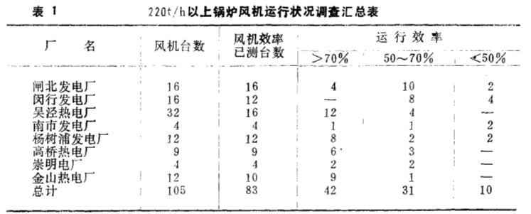 鍋爐風(fēng) 機(jī)的容量 隨著鍋爐容量 的增 長(zhǎng)而相應(yīng)增加 。 一 臺(tái)12 . 5萬千 瓦 機(jī)組, 風(fēng) 機(jī)電動(dòng)機(jī)的 功率 為 25 00 千瓦 , 占機(jī)組容 量的 2 % 。 _ 仁海地 區(qū) 電廠 220 噸/ 時(shí) 以上 鍋爐 有3 。臺(tái), 裝機(jī) 容 量 為 165 萬千瓦, 配 套風(fēng) 機(jī)共有 ]0 5 臺(tái), 電機(jī)功率 為5 . 32 萬 千瓦 , 占裝 機(jī)容量的 3 . 2 % , 其所 消耗的總 電量約 占機(jī)組 發(fā)電量的1 . 8~ 2 . 7% 。 可見 風(fēng) 機(jī)是電 站 中最大的耗能設(shè)備之一 。 從 目前風(fēng) 機(jī)的運(yùn)行狀 況來看, 上 述 105 臺(tái)風(fēng) 機(jī)都是高效離心風(fēng)機(jī), 設(shè)計(jì) 效 率 在 8 1~ 85 % ( 帶進(jìn) 風(fēng)箱 ) 。 但 從調(diào)查結(jié)果說明, 目前風(fēng)機(jī)實(shí)際 運(yùn)行效率普遍較低 ( 見表 1 ) 。 其造 成原因如下: ( i )風(fēng) 機(jī)造 型不 合理 , 富裕量太大, 設(shè)計(jì)工 況與系統(tǒng) 不匹 配 ; ( 2 ) 在變負(fù) 荷工 況下 , 調(diào) 節(jié) 損失 過大 。