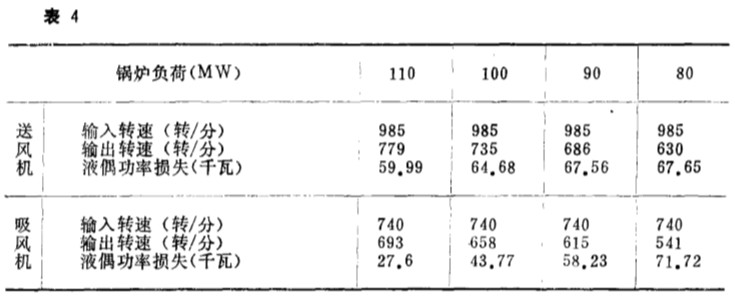 閡行 發(fā)電廠聳 8爐送風(fēng) 機(jī)在設(shè)計(jì)工 況時(shí), 額定功率為 458 . 75 千 瓦 , 吸 風(fēng) 機(jī) 為 49 8 . 95 千 瓦, 液力偶合器在不 同轉(zhuǎn)速比 i 下的功率損失見表 4 。 由表 4 可知, 送 風(fēng)機(jī)液力偶合器的 最 大功率損失不超過 70 千瓦, 吸風(fēng) 機(jī) 液偶的最大功率損失不超過 75 千瓦。 與送 、 吸風(fēng)機(jī) 使用 液力偶合器調(diào) 速調(diào)節(jié)所能節(jié)約的功率相比相對(duì)較小。