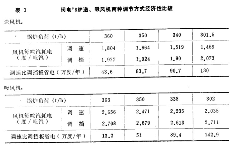 3 . 經(jīng)濟(jì)性比較 表 3 是 閡行發(fā) 電廠 “8爐送 、 吸風(fēng)機(jī)在鍋爐不同負(fù)荷下兩種調(diào) 節(jié)方式 的經(jīng) 濟(jì)性 比較 。 從表 3 中可 以看出, 如年運(yùn)行 以 700 。小時(shí)計(jì)算 ; 在機(jī)組負(fù) 荷 為 110 M W 時(shí) 風(fēng) 機(jī)節(jié) 電為56 . 5萬度/ 年; 10 0人生W 時(shí), 節(jié)電為 11 4 , 7 萬度/ 年; 90MW 時(shí), 節(jié)電為 180 . 1 萬 度 / 年 ; soMW 時(shí) , 節(jié)電為 2 72 . 9 萬度/ 年。 因此, 當(dāng)鍋爐經(jīng)常變負(fù)荷或常處于低負(fù)荷時(shí) , 節(jié) 電效果 還是 相當(dāng)可 觀 的。