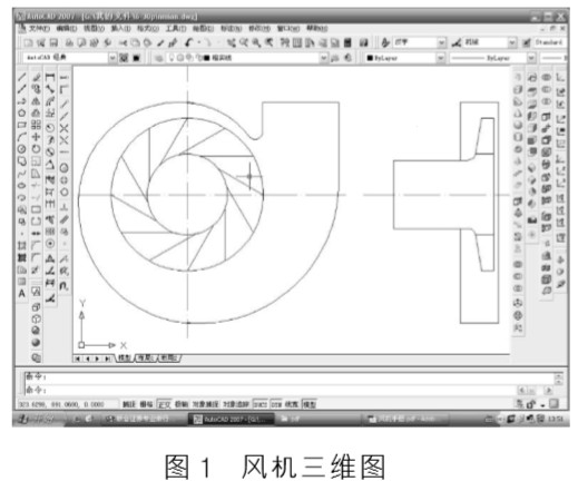 本文以6-30 型風(fēng)機在不同工況下的流 場為研究對象,主要參數(shù)如下:最高效率點 流量 qv=0.8188m3/s,全壓 P=3.98kPa,小流 量取 qv=0.5459m3/s,全壓 P=4.19kPa,大流 量取 qv=1.0917m3/s,全壓 P=3.45kPa,轉(zhuǎn)速 n=2900r/min,葉輪外徑 D2=490mm,葉輪輪 轂寬度 b=39mm,葉片數(shù)Z=12,蝸殼基圓半 徑 R1=274mm,R2=323mm,R3=382mm, R4=451mm,蝸室寬度 B=122.5mm,采用圓 柱形進口管,,工作介質(zhì)為標況下的空氣, 并認為牛頓流體且局部各向同性。蝸殼垂 直 z 軸,軸面為xy平面,垂直紙面向外為z 軸。通過三維軟件 AUTOCAD建模,模型 (除去葉輪前蓋)如圖 1 所示。