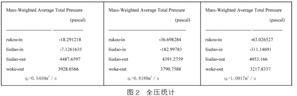 3.1 模擬結(jié)果可信度判斷 以該風(fēng)機最高效率點的工況 q v=0. 8188m3/s,全壓 P=3.98kPa為標準,模擬結(jié) 果風(fēng)機出口和入口的全壓差為3.83kPa,與 給定的風(fēng)機全壓3.98kPa 誤差僅為3.8%, 可以判斷該模擬結(jié)果可信。