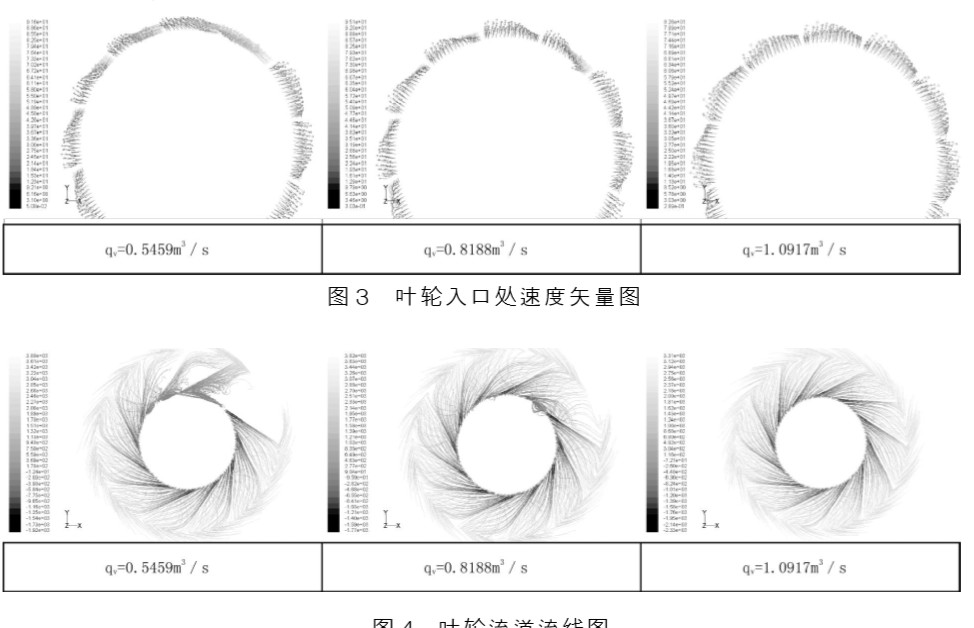 (2)葉輪入口處 圖 3 為葉輪入口處的速度矢量圖。從 圖中可見,當(dāng)風(fēng)機在最高效率點工作時,在 葉輪入口處葉片的工作面上存在一定的逆 流,該處空氣的流動的方向與入口的法方 向偏離較多,而在所有葉輪流道中,這種偏 離又以靠近蝸舌的流道最為嚴重;當(dāng)風(fēng)機 在小流量工作時,這種偏離在靠近蝸舌的 流道部分由葉片工作面一側(cè)發(fā)展到入口的 大部分區(qū)域,且不能流入葉輪。而在順葉 輪旋轉(zhuǎn)方向稍遠離蝸舌的流道部分這種偏 離表現(xiàn)為空氣的正預(yù)旋。值得注意的是,上述情況只在蝸舌附近及靠近蝸舌的部分 流道較為顯著,而在遠離蝸舌的流道部分 影響不大。當(dāng)風(fēng)機在大流量工作時,幾乎 觀察不到逆流,而僅在全部流道入口產(chǎn)生 少量的負預(yù)旋。 .jpg)
