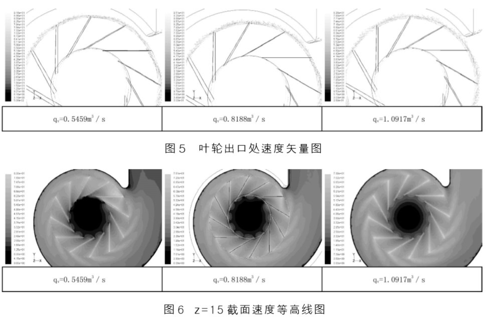 (5)整機速度等高線分布 圖 6 為 z=15 截面風(fēng)機的速度在不同流 量下的等高線圖。圖中可見,在大流量時, 葉輪各流道的入口、內(nèi)部和整機等高線圖 形整齊一致,顯示風(fēng)機內(nèi)空氣流動均勻流 暢;而隨著流量減少,等高線圖開始變形, 特別是小流量時,入口處各流道速度矢量 差異明顯,個別流道內(nèi)流速的變化也劇烈 且不均,顯示風(fēng)機內(nèi)空氣流動不均勻、不 流暢。