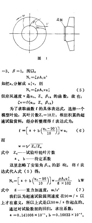 為 了確保離心風(fēng)機(jī)運轉(zhuǎn)的可靠性 , 往往 需 要對其葉輪進(jìn)行超轉(zhuǎn)速運轉(zhuǎn)考核, 并獲得材質(zhì) 強(qiáng)度 、 葉輪結(jié)構(gòu)特征對安全系數(shù)影響等設(shè)計參 考數(shù)據(jù)。 葉輪超速時所耗功率關(guān) 系到試驗臺動 力源的承受能 力。 例如具備5。。 k w 動力的試驗 臺能否完成配用 3 o00k w 以上功率的大中型 鼓 風(fēng)機(jī)葉輪的超速r 解答這一問題的關(guān)鍵是如何 比較準(zhǔn)確的估算超速時的耗功 。 本文分析 了葉 輪超速時的耗功類型及 其機(jī)理, 根據(jù)有關(guān)公式 和試驗數(shù)據(jù)的 回歸, 推薦一個既實用又 可靠的 估算超速耗功的半經(jīng)驗公式。
