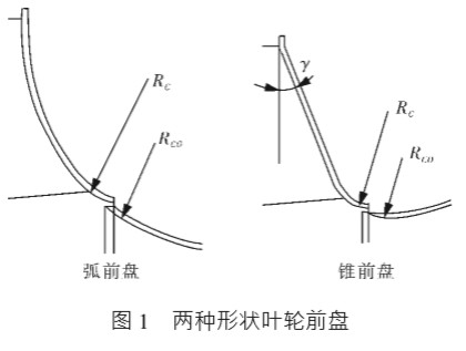 將弧前盤改為錐前盤時(shí),錐前盤下 方實(shí)際上還都保留一個(gè)小圓弧,對于 8 號葉輪約為 30~40mm,就是現(xiàn)在錐前盤 的 RC,它比原來弧前盤的圓弧半徑 RC 小 很多,方便成型,相應(yīng)地錐前盤的進(jìn)風(fēng)口 圓弧半徑 RCO 也比弧前盤的 RCO 要小。在 保持葉輪進(jìn)出口直徑和寬度相同的條件 下,得到相應(yīng)的錐前盤錐角 γ,這樣相應(yīng) 的錐前盤就得到了,見圖 1。
