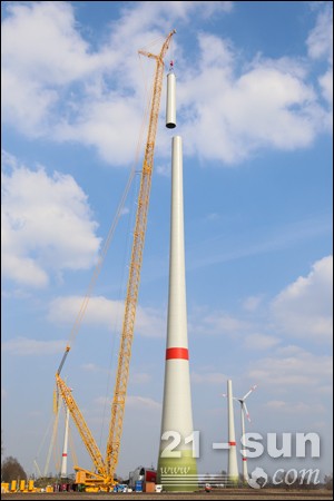 2013年10月,德國 Scharell——位于德國 Saterland’s Ostermoor bog 的 Scharrel 社區(qū)風電場正在興建中,工作重點是架設(shè)大型風機,以便產(chǎn)生“綠色”電能。Franz Bracht Kranvermietung 是專門從事重型吊裝業(yè)務的公司,此次承接了在風電場安裝 Enercon E-101 風機的任務。這些風機是 E-101 系列風機中型號最大的,輪轂高度達 149 米。安裝這些龐然大物,起重機服務供應商依靠的是新型 Terex Superlift 3800 桁架臂履帶式起重機。該起重機能力超群,開發(fā)之初設(shè)計者正是考慮到了此類應用場合的需求。