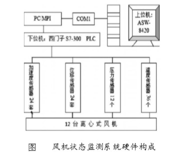 二、離心風(fēng)機(jī)監(jiān)測(cè)系統(tǒng)的硬件構(gòu)成 本狀態(tài)監(jiān)測(cè)系統(tǒng)的監(jiān)測(cè)對(duì)象為 12臺(tái)離心式風(fēng)機(jī)。為了 實(shí)時(shí)采集到風(fēng)機(jī)的振動(dòng)信號(hào)、軸承溫度信號(hào)、輸出風(fēng)壓力信 號(hào), 采用的傳感器))) 變送器包括溫度傳感器、氣體壓力傳 感器、電渦流位移傳感器和三向加速度傳感器。監(jiān)測(cè)系統(tǒng)硬 件的下位機(jī)采用西門子 S7- 300系列可編程控制器以及若 干輸入 /輸出模塊, 主要實(shí)現(xiàn)信號(hào)采集、數(shù)據(jù)傳輸及現(xiàn)場(chǎng)控制 功能。硬件系統(tǒng)的上位機(jī)采用一體化工控機(jī), 型號(hào)為 AW S - 8420, 主要實(shí)現(xiàn)系統(tǒng)管理、信號(hào)處理, 故障診斷等功能。離 心風(fēng)機(jī)狀態(tài)監(jiān)測(cè)系統(tǒng)的硬件構(gòu)成如圖 1所示。