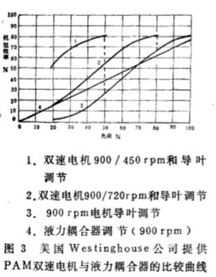 從 圖 3 所示 , 美國西 屋公司 提供的 四種 電動(dòng)機(jī)驅(qū)動(dòng)風(fēng)機(jī)的曲線中 , PA M雙 速 電機(jī) 傳 動(dòng) 調(diào) 節(jié)的效率最高 , 在90o r p m 電機(jī) 驅(qū)動(dòng) 下的風(fēng) 機(jī)采用入 口導(dǎo) 向擋板調(diào) 節(jié)在75 % 負(fù)荷 以上 , 比采用液力藕合傳動(dòng)調(diào) 節(jié) 效 率 高; 在75 % 負(fù) 荷 下 PA M 雙速 電機(jī) ( 90 0 / 7 2or p m ) 的 效 率可達(dá) 80 % , 而單一 的入 口導(dǎo) 向擋板和 禍 合器 傳動(dòng)調(diào) 節(jié)的效 率 只有 60 % 。 因此 , 風(fēng)機(jī)在高效 下 長 期運(yùn)行 , 就 能節(jié)省相 當(dāng)?shù)碾娏?。 為 了配 合調(diào) 峰 , 閘北發(fā)電廠 將 一 臺(tái)125 M W 機(jī)組的兩 臺(tái)吸風(fēng) 機(jī)改為 雙 速 電 機(jī) ( 740 / 5 60 r p m ) , 取 得 了 明顯的節(jié) 電效果 。 閡行 發(fā) 電 廠 一 臺(tái)36 0 t/ h 鍋爐 送、 吸 風(fēng)機(jī)采用Y O T C型 液