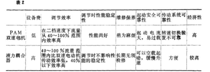 電機(jī)傳動(dòng)和液 力藕 合器傳 動(dòng)是 目前火 電廠鍋 爐 風(fēng)機(jī) 比較理 想的調(diào) 速裝置 。 表 2 是雙速 電機(jī)和液力藕合器兩 種調(diào)節(jié)方式的 比較。 由于風(fēng)機(jī) 的節(jié)能工作還 涉及到管理 、 風(fēng)機(jī) 本身的效率 、 設(shè)