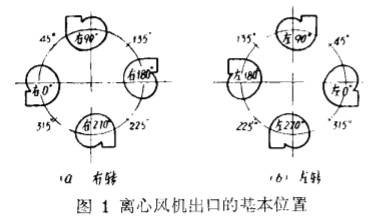 經(jīng)過換算, 在標(biāo) 準(zhǔn)狀態(tài)下 , _ L 述 三臺離心風(fēng)機(jī)的 比轉(zhuǎn)數(shù) ( n , ) 都很小, 按 國際單位制 (5 1) 基本上是在 1 . 弱一 6 . 14 ( 相當(dāng) 于 Mk fs 制 為 10~ 35 )范圍內(nèi)。 這 三臺風(fēng)機(jī)都是懸 臂式 結(jié)構(gòu) , 各 由一 臺 二極的交流電機(jī)用一對 三角皮帶 輪 增 速 傳 動 , 它相 當(dāng)于 我國 風(fēng)機(jī)行業(yè)中現(xiàn)行 習(xí)慣 稱 呼 的 “ C 式” 傳動結(jié)構(gòu)。 渦殼的出日 方 向有 八 個基本位置( 圖 1 ) 。 其中循環(huán)風(fēng)機(jī)和廢 氣風(fēng) 機(jī)還可實(shí)現(xiàn) “ 右轉(zhuǎn)” 或 “ 左轉(zhuǎn) ” . 以上 可根 據(jù)用 戶使用要求來改變 。