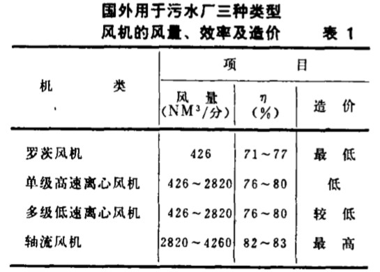一 、 概況 表 1 是根據(jù)美國國家環(huán) 保局提供 的70 年 代末國外用于 污水 廠的三種 類型 風(fēng) 機 的風(fēng)量、效率和造價一 覽表 。