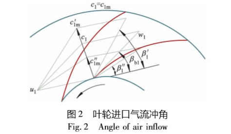 2. 4 進(jìn)口導(dǎo)流器 如前所述,喘振產(chǎn)生的內(nèi)因是由于進(jìn)入葉輪的 氣流沖角增大而引起的旋轉(zhuǎn)脫離[14]. 圖2 為不同角度氣流進(jìn)入風(fēng)機(jī)葉輪時的狀 態(tài)[15]. 設(shè) β1 為氣流沖角. 圖中 βb1為葉片進(jìn)口安放 角; c1, u1, w1 分別為設(shè)計(jì)工況下的絕對速度、牽連運(yùn) 行速度、相對速度; c1m為軸面速度,即 c1 在軸面上的 投影; c'1m, c″1m分別為大流量和小流量時的軸面速度; β' 1, β″ 1分別為大流量和小流量時的氣流沖角. 由于葉 輪為徑向葉輪,軸面速度與絕對速度相等,即方向、 大小相同: c1m = c1.
