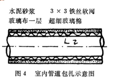 底層用 超細玻璃棉厚5cmc , 然后用 一層 玻璃布扎緊, 目的起吸 聲作用 , 再用鐵絲軟 網(wǎng)纏 繞一層, 水泥 砂漿抹面厚 3cm , 起 隔聲 作用 。