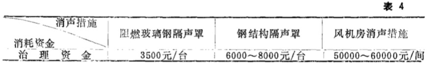 5 . 2 . 1 . 節(jié) 約治理資金。 表 4 是同類型 風機及風機房消聲措施所消耗資 金 的 比 較 表。